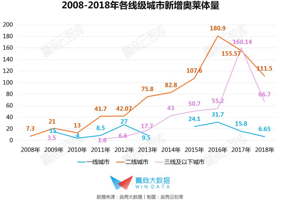 2008年至2018年,一线城市的新开业奥莱体量缓慢上升,发展趋势较为平缓;二线城市的新增体量不断增长,由2008年的7.3万㎡最高增至180.9万㎡,由此可见,二线城市是奥莱业态十年间发展的主阵地,发展潜力很大。