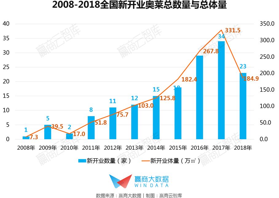 但在2018年,奥莱的新增数量为23家,新增体量仅为184.9万㎡,同比2017年分别锐减了32%及44%。
