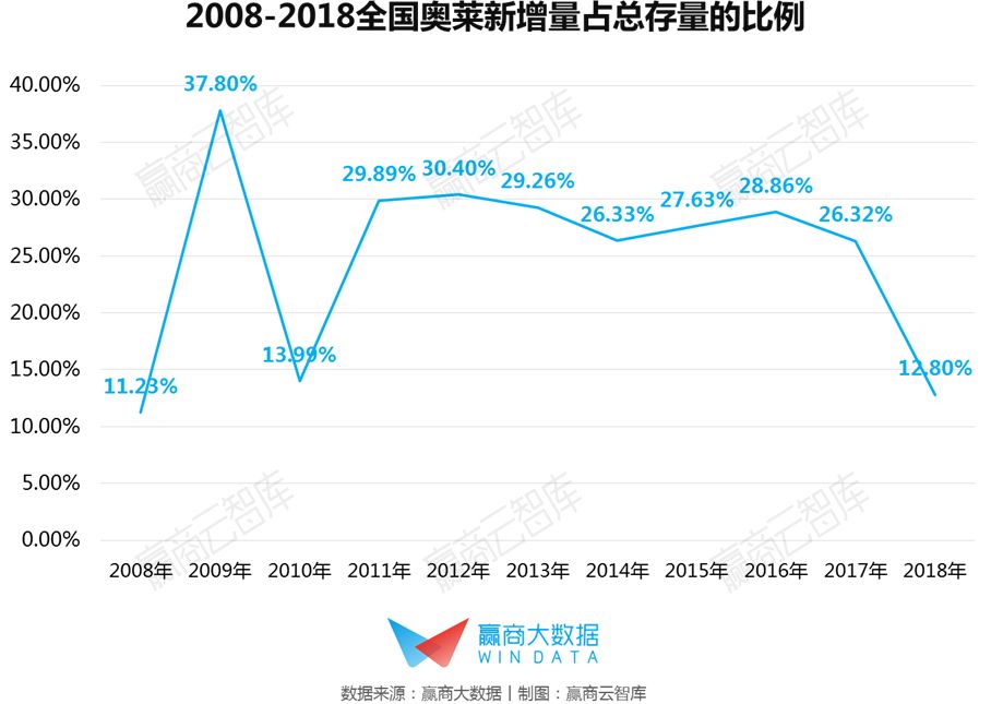 就增长率而言,十年间,奥莱规模的增幅波动较大,数量及面积的波动规律基本一致:2008年至2011年间,由于消费者认知度尚低,市场尚未培育,奥莱存量的绝对值较低,使得增幅容易波动。