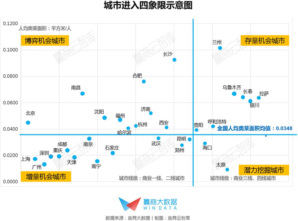 属于商业三四线城市/人均奥莱面积低于均值的城市:意味着城市消费者进入奥莱的频次较低,消费习惯的培养和奥莱吸引力的提升都需要挖掘机会。