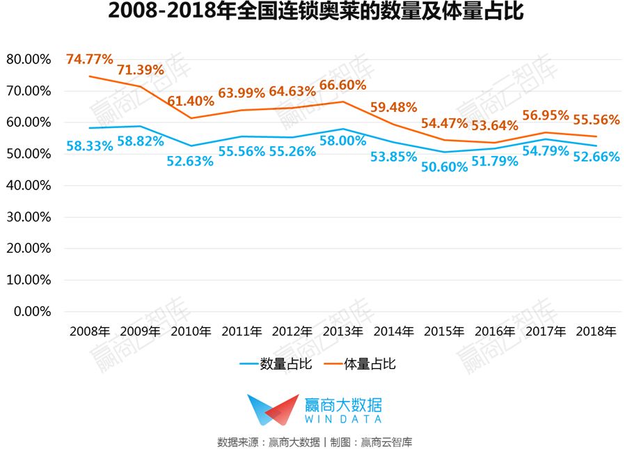 2008年至2018年,连锁奥莱项目的数量占比稳定在50%至59%之间,体量占比则由2008年的75%降至2018年的55%,这是因为单体奥莱不断入市,稀释了原有比例。