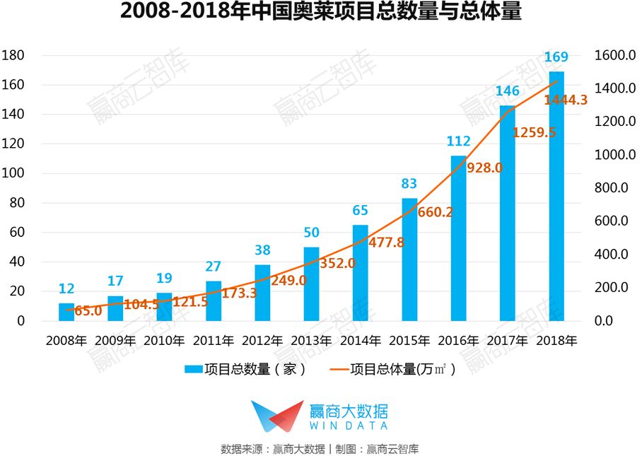 据赢商大数据监测,2008年至2018年,国内奥特莱斯行业规模不断增长,项目总数量由12家增长至169家,项目总体量由65万㎡增长至1444万㎡。