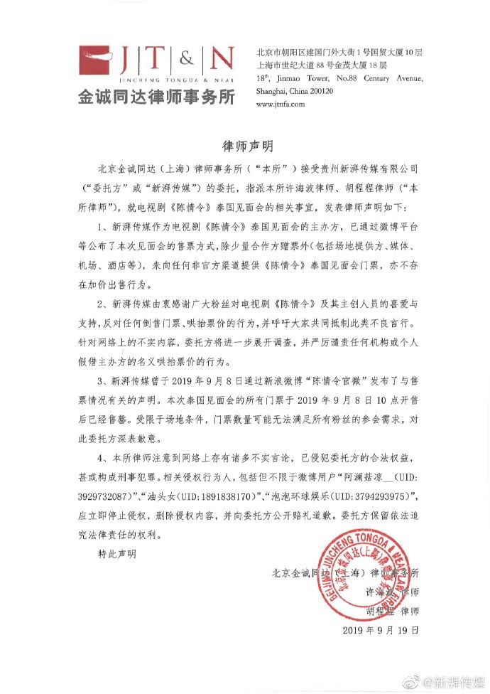 在此前泰国见面会那一场的门票坐地起价上,新湃传媒就陷入了粉丝“加价出售”的质疑,但很快的,新湃就发表了声明,严正说明从未有过加价出售的行为,并严肃的谴责了哄抬票价的市场行为。