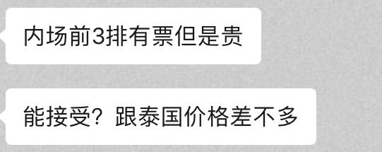 其中还有一个黄牛,在告知“前三排有票,价格与泰国差不多”之后,因娱sir迟迟未付定金,对方认为无诚意购买,留言互删“微信人满了,留给需要的人吧。”