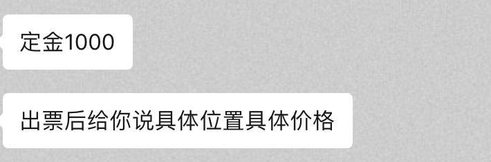 由于市场行情火热,处于供不应求的状态,并不是所有黄牛卖家都会回复。但从黄牛处购买的流程,都是先付定金500到1000(内场1000,其他500),出票后对方告知具体位置和最终价格,之后买家补款,卖家寄票,完成交易。