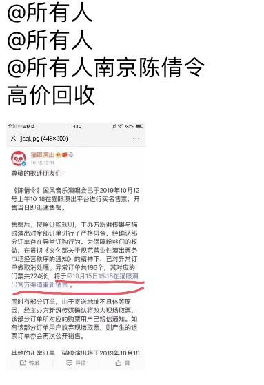 昨日,猫眼演出官方微博表示,“核实部分订单存在异常订购行为,已对异常订单做取消处理。异常订单共196个,其对应的门票共224张,将于10月15日15:18在猫眼演出官方渠道重新销售。”