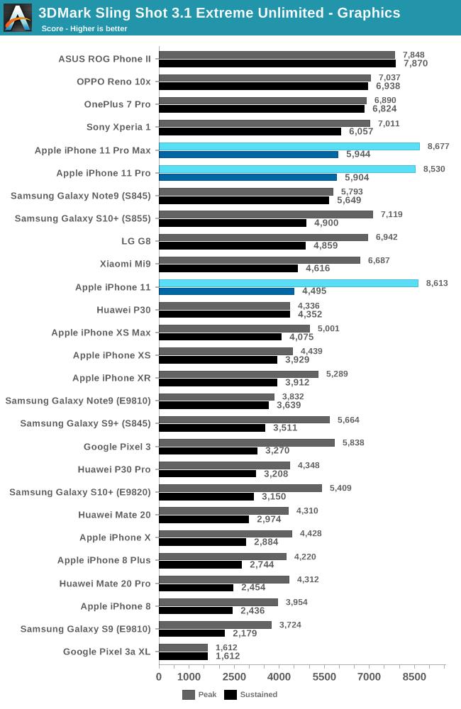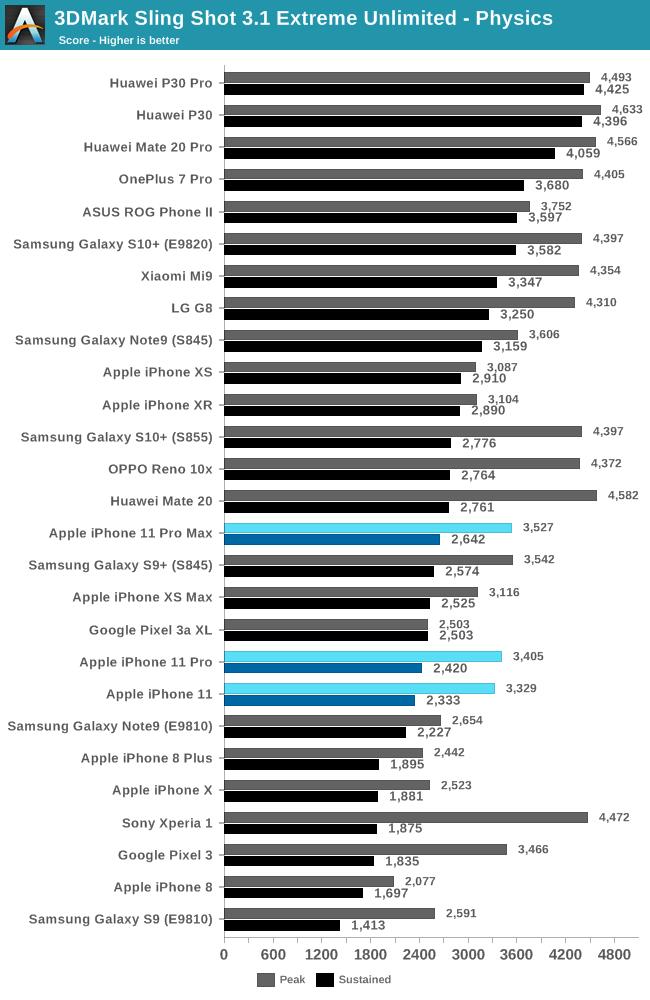 从3DMark中的物理测试开始,实际上,在GPU工作负载期间受功率限制时,这实际上更多地是CPU工作负载。在这种情况下,与去年的iPhone相比,iPhone 11在峰值性能方面的表现要好一些,但是它们并不能完全保持与A12 iPhone相同的持续性能。