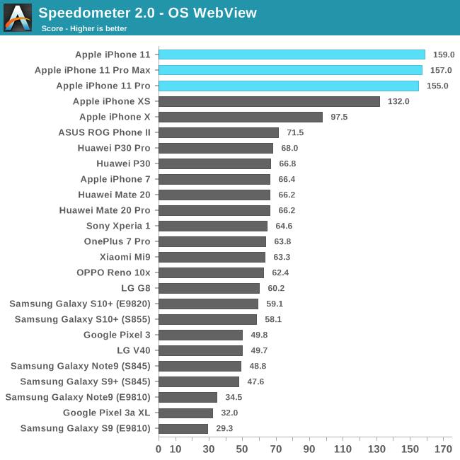 像网络浏览器的工作负载一样,iOS13也为过去的设备带来了性能改进,因此我们重新运行了iPhone X和XS评分,以便与新iPhone 11进行适当比较。