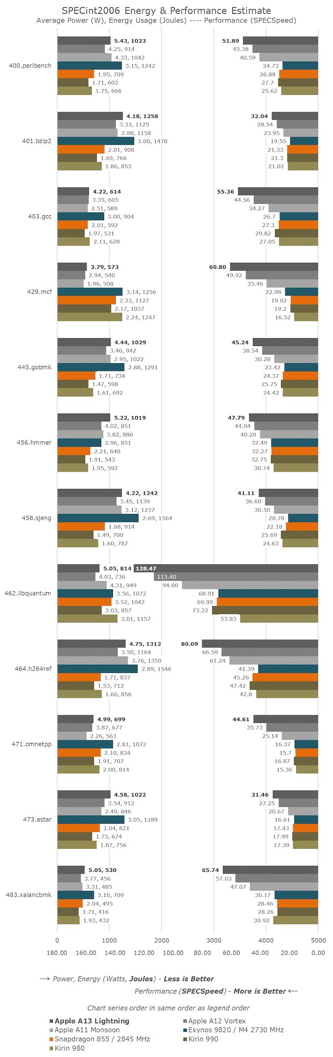 尽管性能数据非常简单明了,而且没有任何令人惊讶的地方,但另一方面,功率和效率数据却极其出乎意料。在几乎所有的SPECint2006测试中,Apple都采用了A13 SoC并提高了峰值功耗。因此,在许多情况下,我们比A12高出近1W。在这里,在性能达到峰值时,功率增加似乎大于性能增加,这就是为什么在几乎所有工作负载中,A13的效率都低于A12的原因。