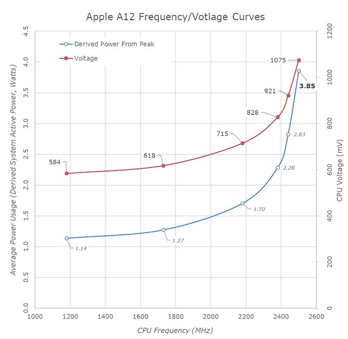 令人震惊的功率数字的一种可能解释是,对于A13,苹果公司在新的Lightning核心的峰值频率处处于频率/电压曲线的远端。在上图中,我们估算了去年A12的功率曲线–在这里,我们可以看到Apple非常保守,其电压直到最后几百MHz。对于A13而言,苹果在随后的频率状态下可能更激进。
