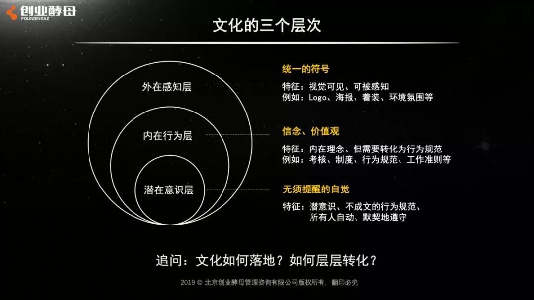 我们希望在企业内能够打造和塑造的也是第三层的文化,但这个步骤本身是急不来的。而如果只是挂在墙上的标语,永远只能留在第一层的文化。