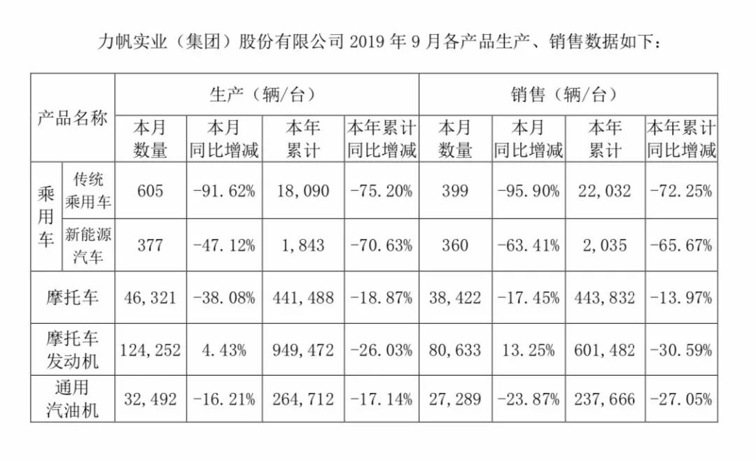 近几年,力帆汽车的发展确实遇到了困难。力帆股份10月15日发布的9月产销快报数据显示,力帆乘用车、摩托车业务全线下滑。今年前9个月,力帆传统乘用车累计销量约2.2万辆,同比下滑72.25%;新能源汽车累计销量2035辆,同比下滑65.67%;摩托车累计销量约44.38万辆,同比下滑13.97%;摩托车发动机累计销量约60.15万台,同比下滑30.59%;通用汽油机累计销量约23.77万台,同比下滑27.05%。