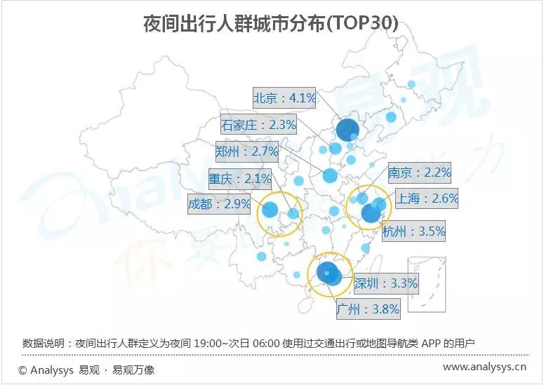 一线代表北京、广州分别以4.1%、3.8%的夜间出行人群占比领先其他城市,核心因素是两城人口基数大,且陆续出台夜间经济发展政策,不断完善基础设施和公共服务体系,扶持与鼓励夜间活动更加多元、创新与包容,夜间出行需求被极大激发;