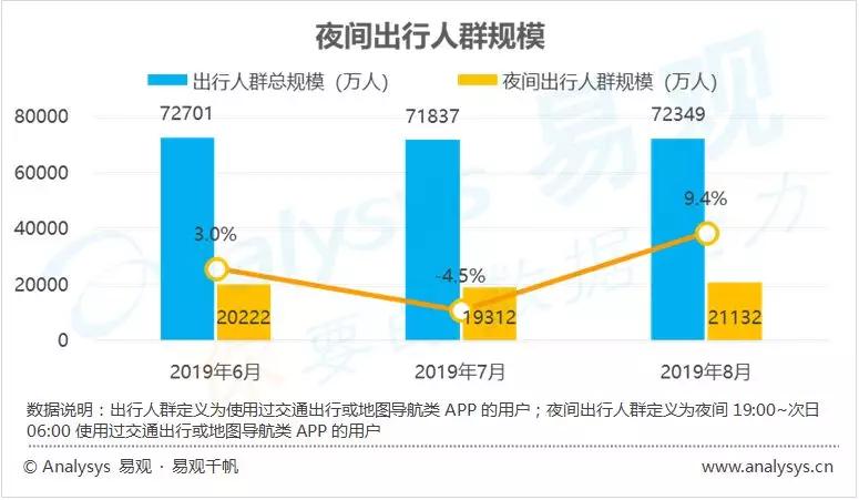 根据易观千帆检测数据,2019年6-8月出行人群总规模趋于稳定,活跃人数达7.2亿人,其中夜间出行人群规模约2亿人,占出行人群规模总量近30%。6月因端午节假期的拉动夜间出行人群略有增幅,后经历7月小幅下降,8月逐渐回升,环比增长9.4%。