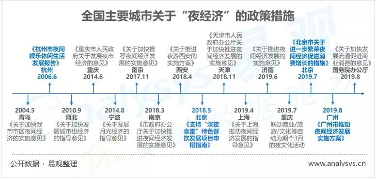自2004年以来,青岛、杭州、重庆、南京、北京、上海、广州等众多城市均陆续发布推进夜间经济发展的实施方案,积极布局城市发展夜间经济功能区域,促进多种消费业态发展,同时推出环境改造、亮化工程、增加休闲配套、加强公共服务配套等措施,旨在通过政企合力扩大消费、繁荣市场经济、促进就业,提升城市“软实力”。