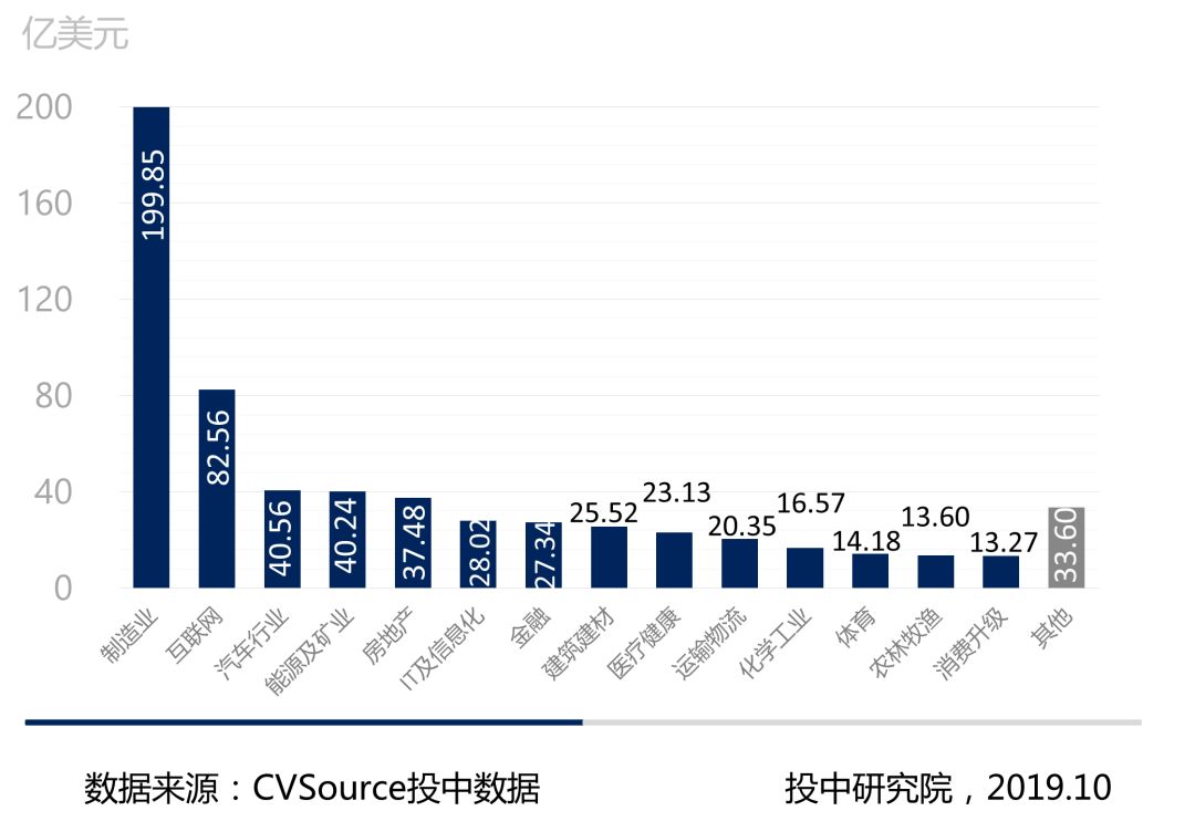 2、根据CVSource投中数据显示,2019年Q3制造业交易数量最多,共164起,占比29.0%,其次分别为医疗健康、金融、能源及矿业、以及房地产等。就披露交易规模来看,2019年Q3制造业占比最大,以199.85亿美元占比32.4%,紧随其次为互联网82.56亿美元,占比13.4%。汽车行业、能源及矿业以及房地产,交易金额分别为40.56、40.24、37.48亿美元,相应占比为6.6%、6.5%、6.1%。