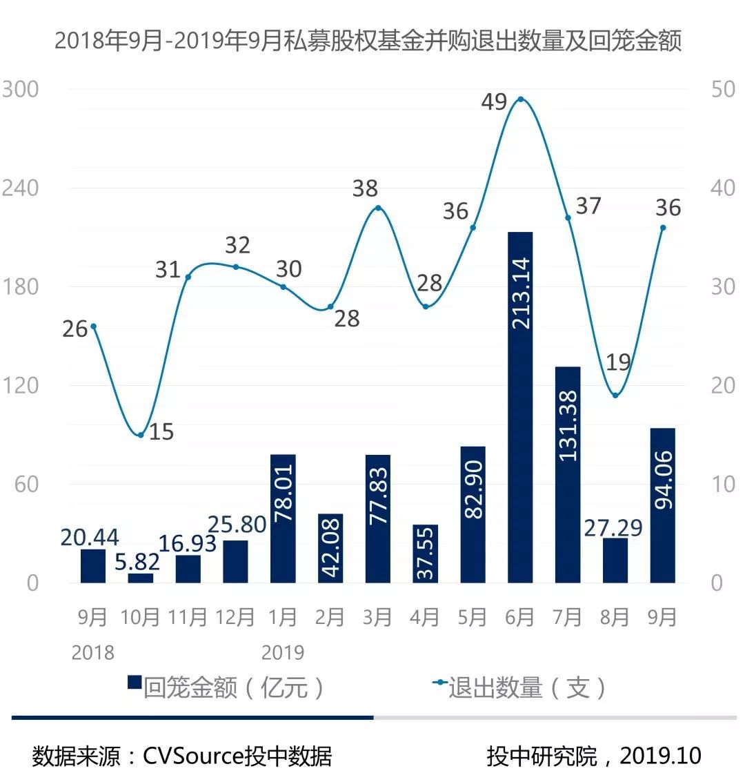 9月私募基金对中企并购的数量和交易规模双上升;2019年Q3私募基金以并购方式退出回报金额同比微幅上升。