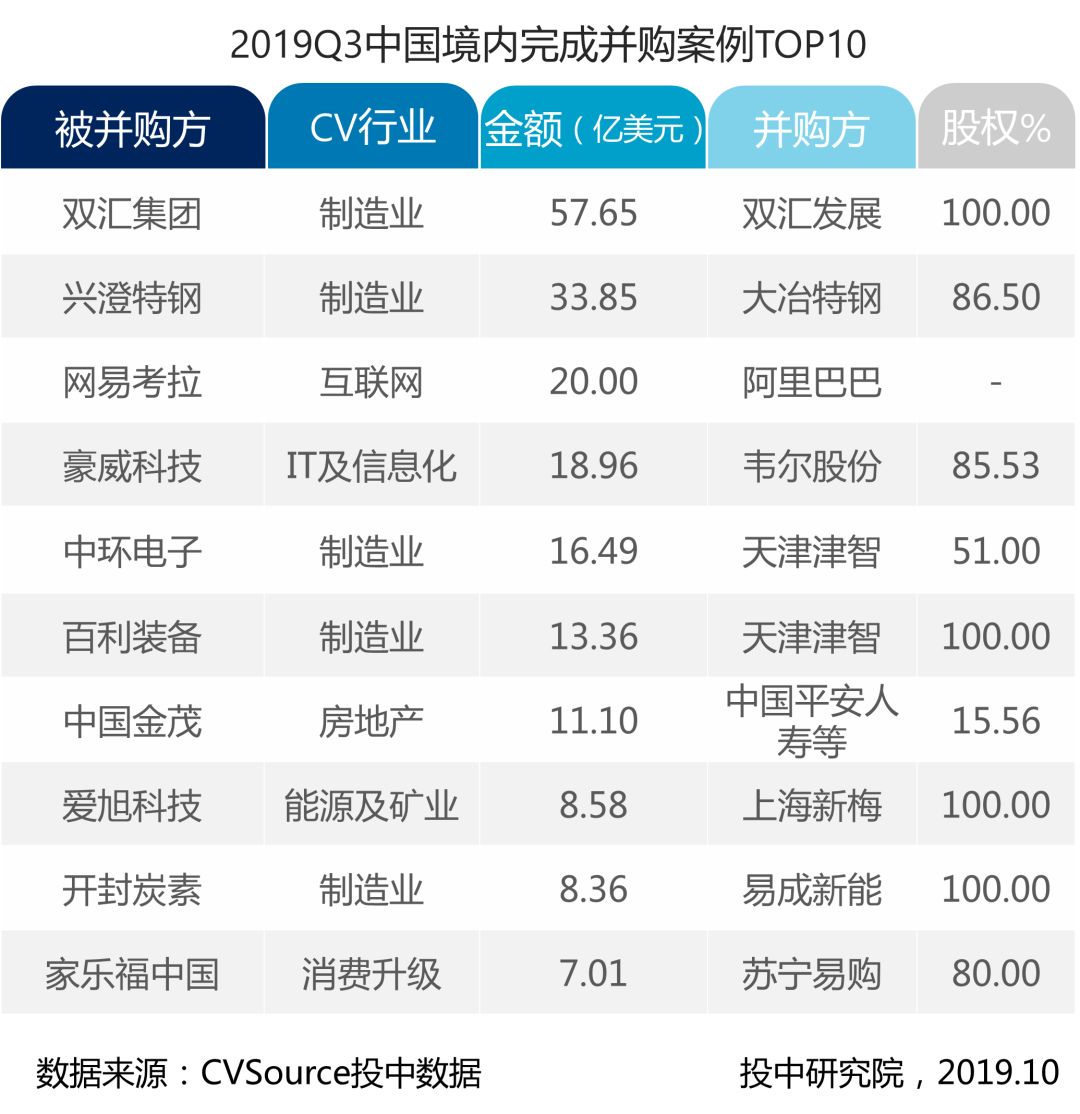 表1- 2019年Q3中国境内完成并购案例TOP10