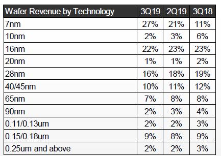 按芯片制程分,7 纳米制程出货占公司Q3晶圆销售金额的 27%,占比大幅提升,去年同期及上季分别为11%及21%,反映7nm芯片当前的需求强大。另外,10 纳米制程及16 纳米制程出货分别占全季晶圆销售金额的2%及22%。整体看,先进制程(包含 16 纳米及以上更先进制程)的营收达到该公司全季晶圆销售金额的 51%。