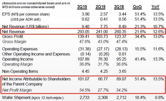 Q3营收为新台币2930亿元新台币(约合95.7亿美元),远超市场预计的2848亿新台币(约合93亿美元),同比增长12.6%,环比增长21.6%,就公司的大体量而言,增速相当恐怖。突出增长得益于7nm新品的热卖,苹果、华为、AMD等客户都推出了新一代7nm芯片,包括麒麟990系列、A14及锐龙3000、RX 5700系列等,期内iPhone 11的热销大幅拉动需求。