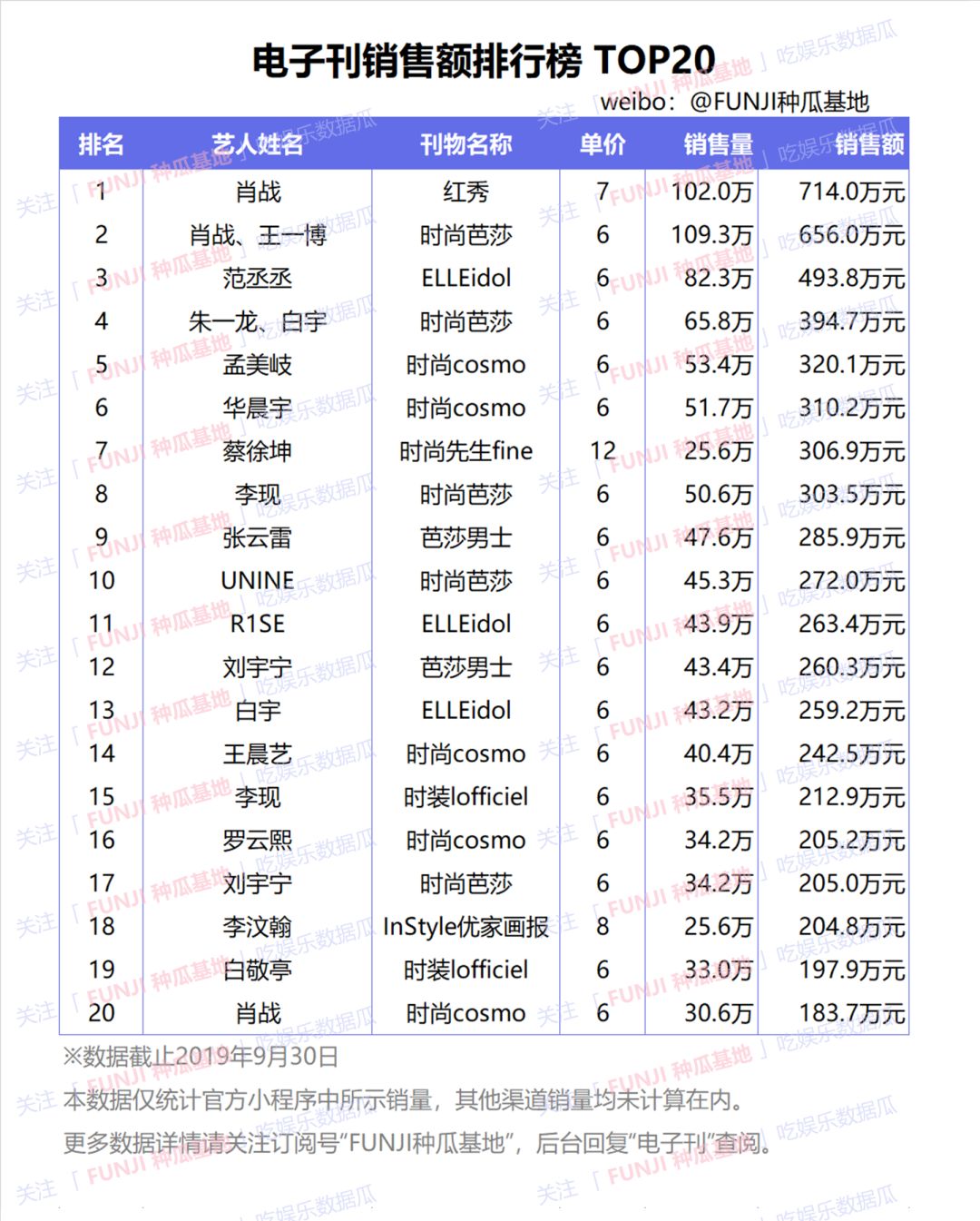而现在,市面上较为常见的电子刊已经有二十余本。据FUNJI(ID:FUNJIdata)统计,截至9月30日,共有二百余位艺人登上过电子刊,累计销售总额已高达一亿两千五百多万元。而这个数字还在被不断刷新。