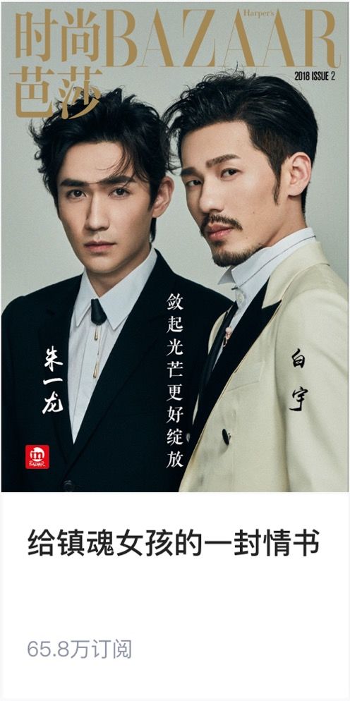 18年7月,朱一龙和白宇登上了《时尚芭莎》电子刊的创刊,主题是《给镇魂女孩的一封情书》,正式将电子刊变为了付费阅读。这期电子刊在电视剧《镇魂》的高热度加持下,迅速售出了六十余万本,一度成为后续粉丝衡量电子刊销量的标杆。