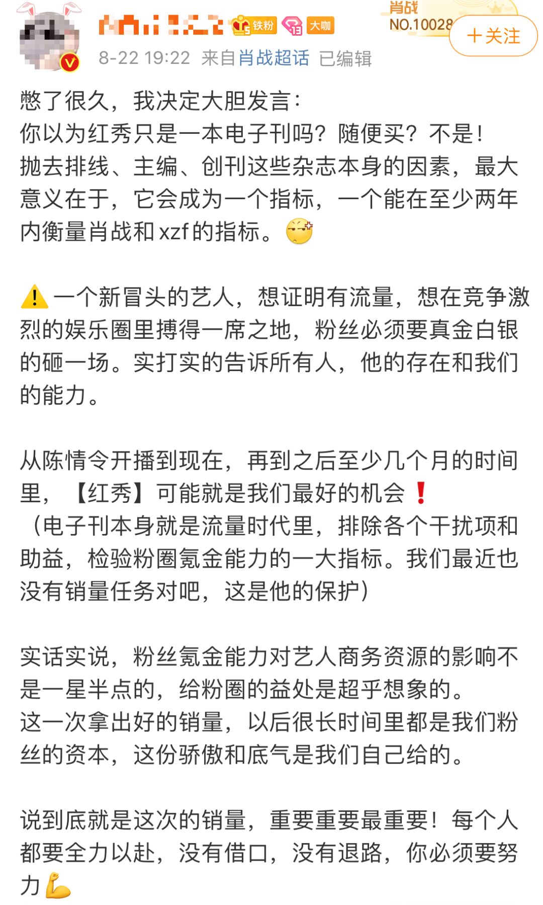 图为一位肖战大V粉丝对购买偶像某期电子刊意义的公开阐述