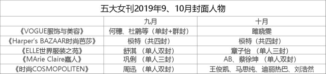 以今年的五大女刊在九、十月的封面为例,杂志选择的主要还是具有资历和口碑的演员和模特。新生代流量艺人想要登上一、二线杂志的正刊封面?很难。