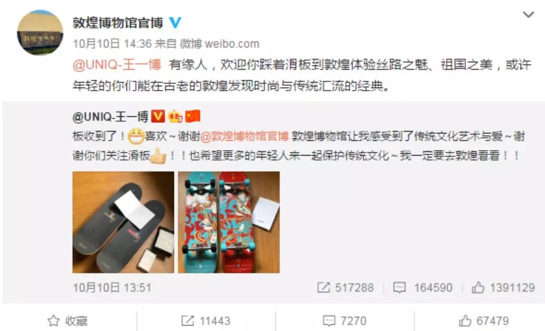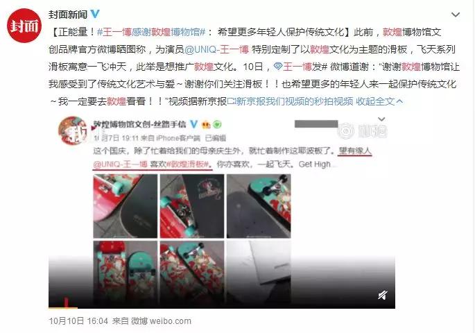 而这次合作双方选择的结合点也恰到好处。王一博滑板少年的形象深入人心,敦煌博物馆送给他的则是有敦煌纹样的潮流滑板。既突出了自家博物馆的特点,也彰显了博物馆产品的创新属性,品类大大超出了博物馆的老几样。