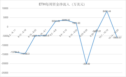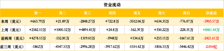 资金方面,本周资金波动较大,周五净流出资金最多,超过 3500 万美元;周四净流入资金较高,但只有 700 万美元。