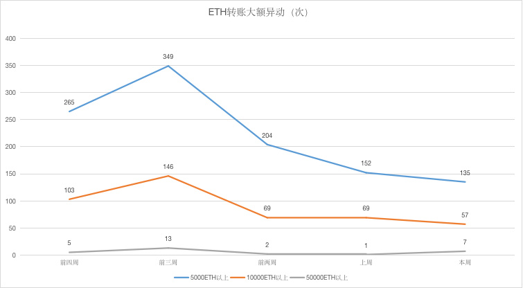 Tokenview数据显示,链上转账次数本周小幅下降,其中 “5 千 ETH 以上”以及“1 万 ETH 以上”转账次数均环比下降超过 10%;但“5 万 ETH 以上”转账次数大幅上涨,超过 600%。