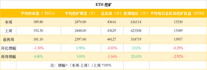 etherchain.org数据显示,目前平均挖矿难度 2470 T,环比上涨 1%;平均算力环比下跌 1.3%,暂报 190 TH/s。本周新增地址环比上涨 2%。