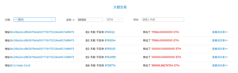 本周,“5 万 ETH 以上”转账次数共计 7 笔,最大转账金额 30 万个 ETH;其中 4 笔转账为同一地址转入交易所 Gate 冷钱包地址,最大金额 10 万ETH;另外 3 笔转账为交易所Bitstamp冷钱包地址转入三个不同的新地址,目前均尚未分拆,接下来可能会有新的动作,值得关注,三个新地址分别是: