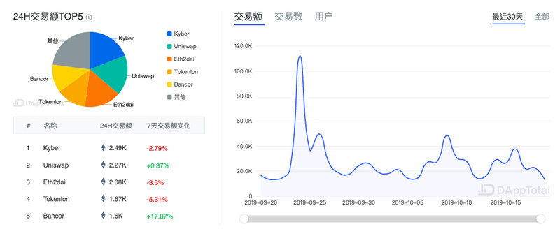 24H交易额前五的交易所中,Tokenlon 七日交易日跌幅最大,达到 4%;Bancor 七日交易日涨幅最大,达到 17%。
