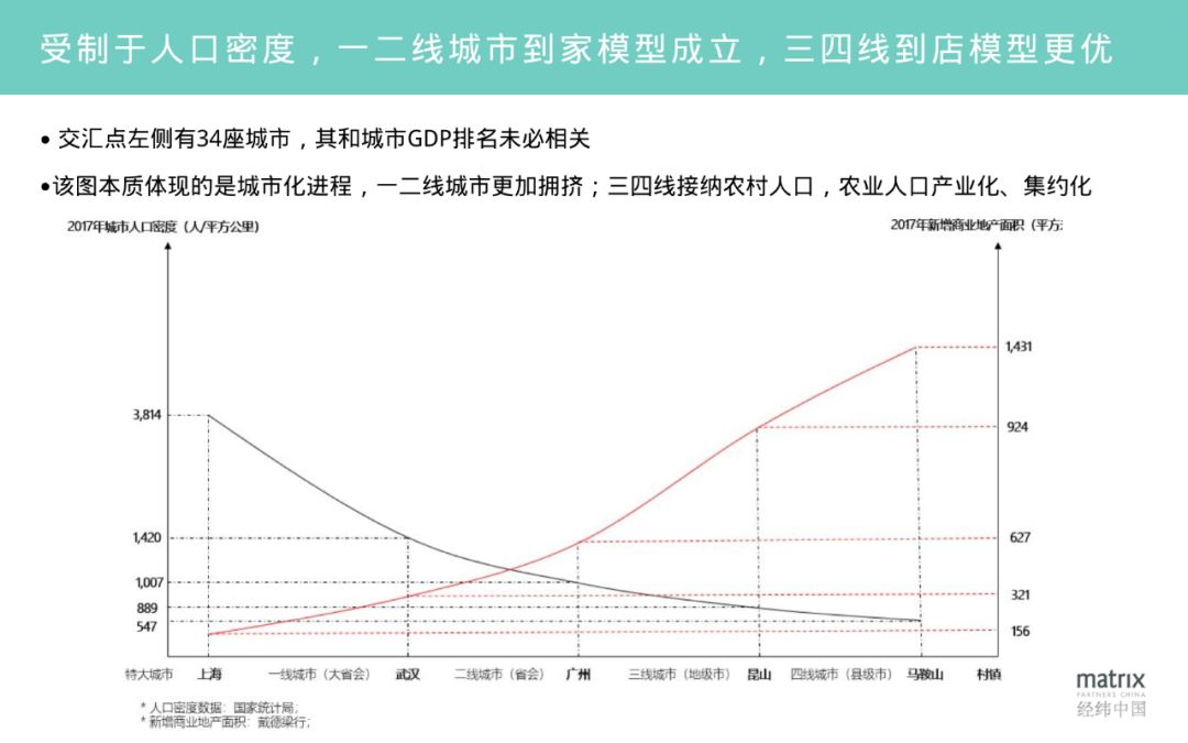 究竟是 到家 还是 到店 ,核心取决于两个要素,一个是 人口密度 ,一个是 新增商业地产的面积 。人口密度越高,新增商业地产面积越少的地方,租金越高,菜市场就越少,越适合到家;而人口密度越低,新增商业地产供给充裕,租金越低,开店的模型越划算。