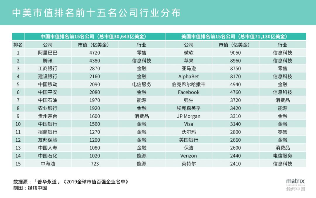我们再来看看这个领域的机会有多大,下图是普华永道在今年年中发布中国和美国市值排名前十五名的公司的情况: