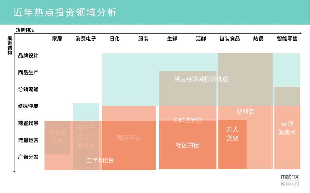 下图是经纬做的一个行业总结,这个图将从2017年开始创投行业所发生的热点的投资领域,把 “品类按照消费频次从低到高,把渠道结构从后到前” 做了一个坐标轴,我们会发现近年投资热点很多都落在终端和流量侧,而供应链领域依然还是一大片未被主流投资领域所关注到的蓝海。
