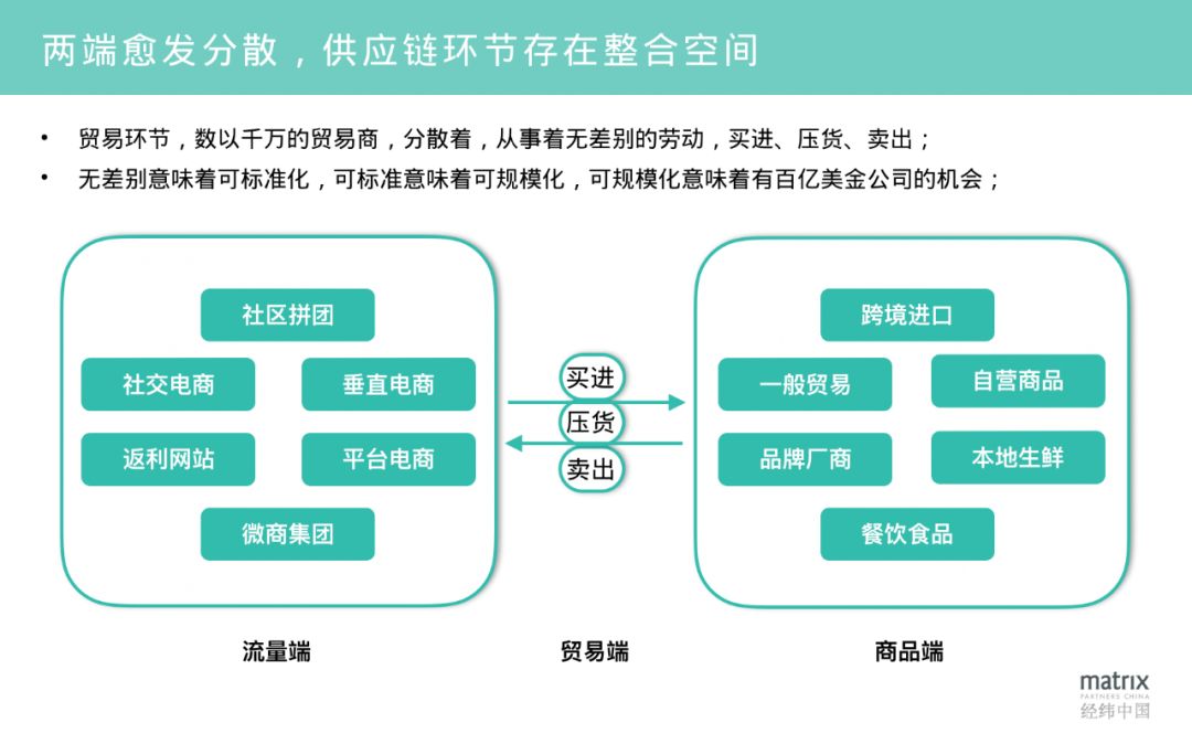 产、供、销三端不断在分离,而产销端都各自变得越来越分散 ,我们就得到了下面的这个趋势图。在“供”这个环节,本质上所有的贸易商或者经销商都在从事着无差别的劳动,就是买进、压货、以及卖出给下一个层级的贸易商或者是终端。 从供这个层面,无差别就意味着可标准,可标准就意味着可规模,可规模就意味着有百亿美金公司的机会 。