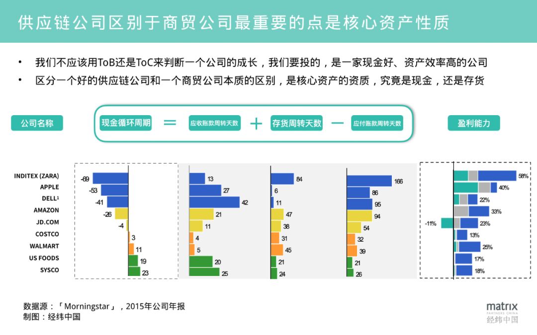 最后一个部分,我们想用一张图来讲清楚,供应链公司和商贸公司以及B2B公司的区别。很多人会说不喜欢投ToB的公司,觉得ToB的公司成长慢,不如ToC的公司涨得快。 其实,一个生意成长快慢与否,取决于一个很重要的指标,叫 现金循环周期(Cash Conversion Cycle) ,体现在财务指标上,就是公司的 应收+存货-应付 。