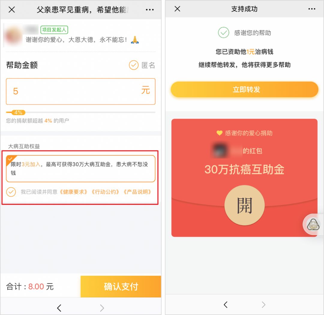 其次, 利用生病筹款的场景,来唤醒用户购买疾病保障的意识。