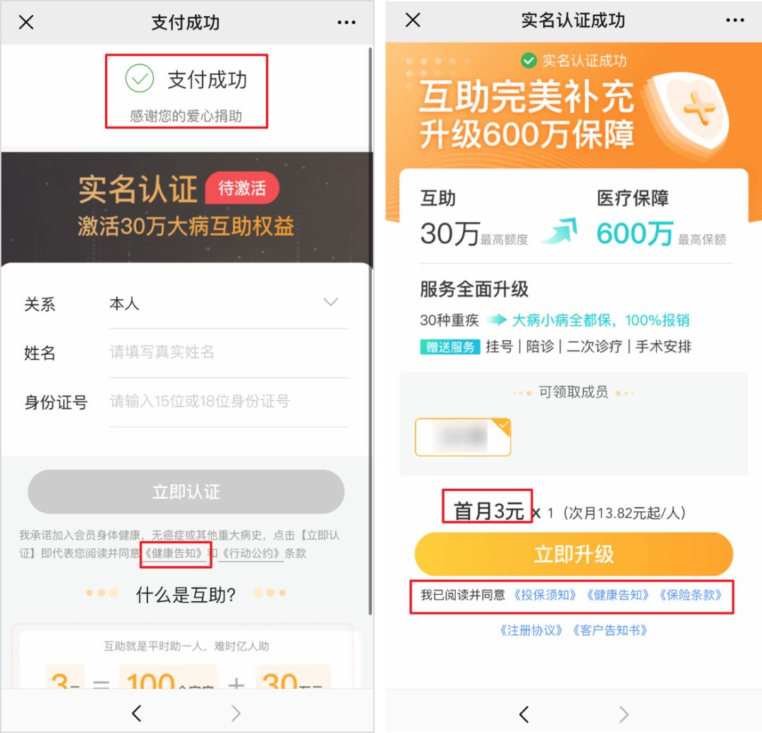 同样神奇的是,轻松筹的互助也是在我支付成功之后,才提醒我确认身份信息,并且“健康告知”跟“隐私条款”一样,只有极容易忽视的“默认同意”的一行小字。