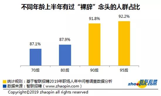 去年,日剧《大叔的爱》中这句台词刷了屏。继“佛系”、“秃了”之后,这届90后又多了一个标签——裸辞。今年6月,智联招聘发布的《2019职场人年中盘点报告》显示,90.4%的人上半年动过裸辞的念头。从70后到95后,这个比例逐渐提高。