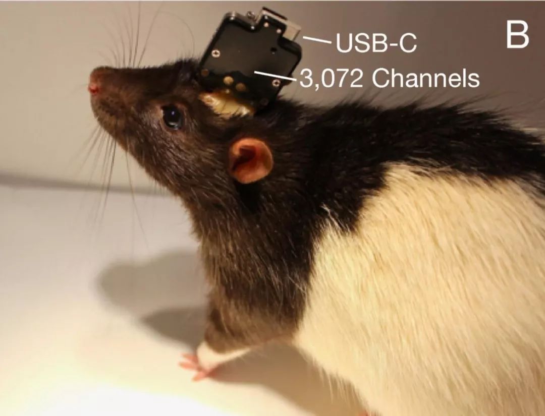 (Neuralink的传感器芯片曾在老鼠身上实验,通过USB-C端口连接到外界)