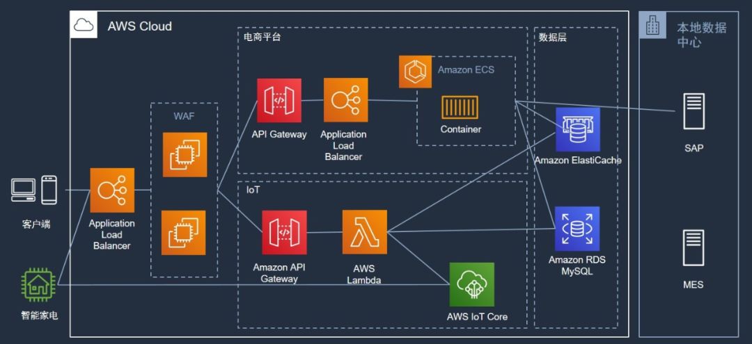 但格兰仕过去传统架构设计的信息系统已不再适用,在数字化转型过程中,格兰仕在对比了众多解决方案后,最终选择利用 AWS IoT 、AWS ECS 等 AWS 解决方案完成了电商平台与物联网平台的开发部署。