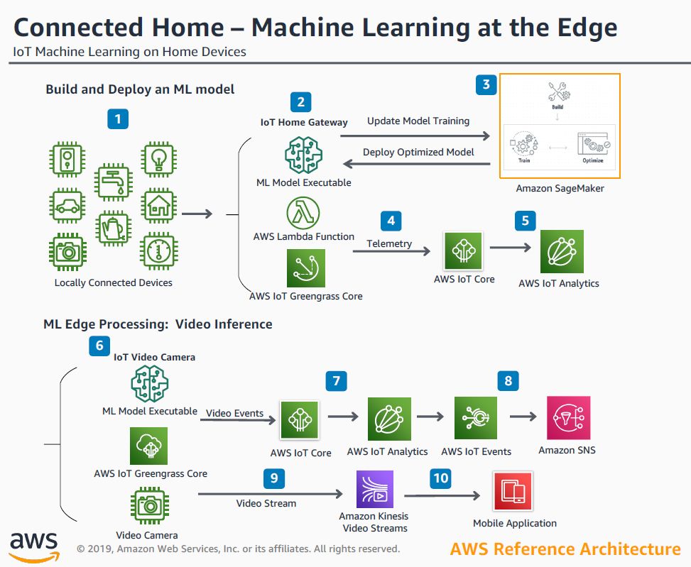 在 AWS 智慧家庭设备的解决方案中,用户可在 Amazon SageMaker 中构建预测模型以用于场景检测分析,并对其进行优化以便在任何摄像机上的稳定运行,然后部署该模型以便预测可疑活动并发送警报,实现在云中构建、训练和优化机器学习模型,并在本地设备进行推理的高效响应。