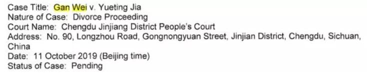 在贾跃亭提交的个人申请破产文件中,贾跃亭与甘薇的婚姻已经处于“divorce proceeding”状态,即,离婚处理中。而这个离婚申请,是在老贾申请破产的前三天才处理的。