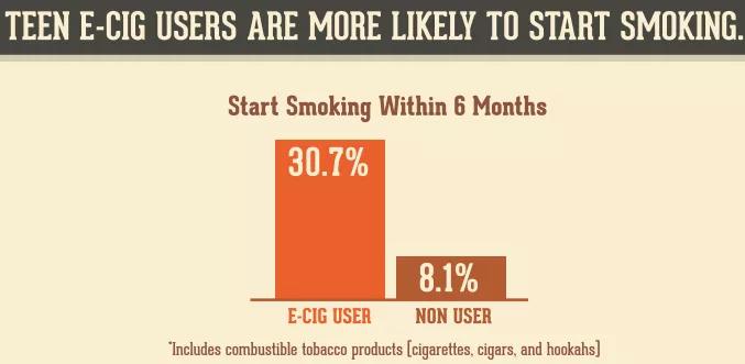 青少年吸食电子烟之后,30.7%的人会在6个月内开始吸食可燃烟草制品,包括常见的过滤嘴香烟、雪茄和水烟。在没有电子烟的诱导之下,这个数字只有8.1%。