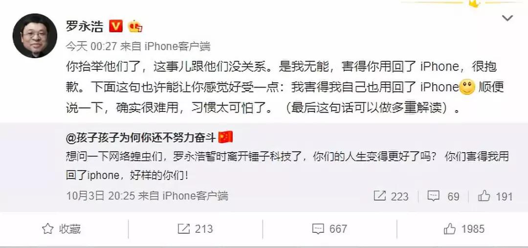 10月4日,罗永浩表示,他重新用回了iPhone。