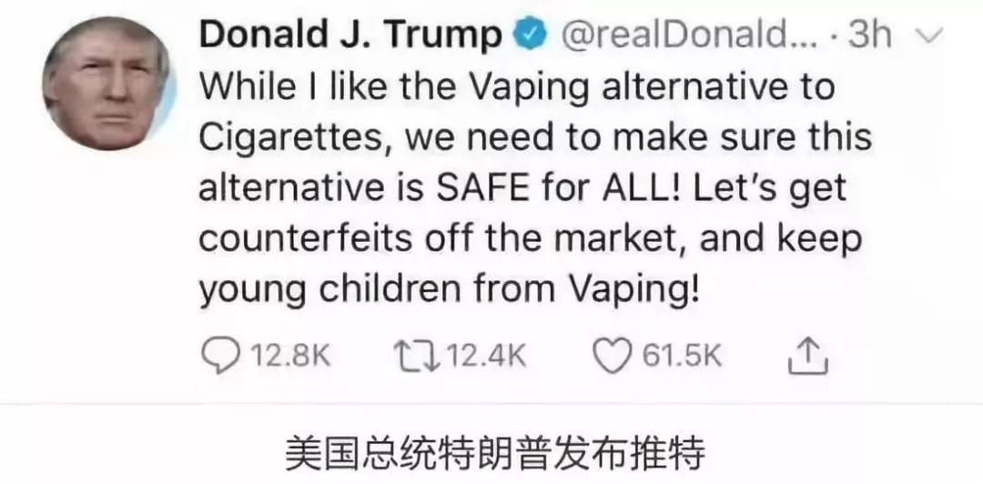 9月13日,特朗普表示:“我更喜欢雾化电子烟能替代传统香烟,但需要确保这种替代方案对所有人都是安全的。让我们把伪劣品从市场上清除,让我们的孩子远离电子烟!”