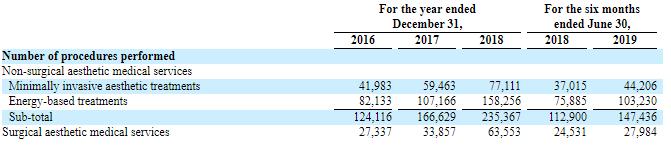 其中, 非手术美容治疗的次数从2016年度的124,116次增至2017年度的166,629次,增长了34.3%;并进一步至2018年度的235,367次,同比增长了41.3%。而手术美容治疗的次数从2016年度的27,3377次到2018年的63.553次,增长幅度更大。